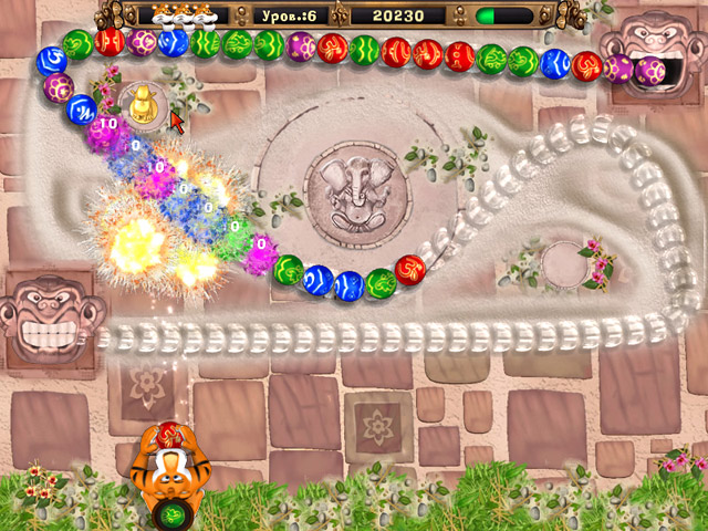 Посмотреть скриншот БенгалПредставляем вам игру «Бенгал», которая является отличной смесью таких шедевров, как Зума и Луксор. Управляя тигром, вы должны кидать разноцветные шарики по движущейся цепочке из таких же шариков. При этом вам нужно составлять цепочки из не менее трех одинаковых по цвету шаров. В этом случае они исчезнут. Не дайте цепочке докатиться до пасти Каменной Обезьяны. В этом случае придется уровень начинать сначала. В прохождении уровней вам помогут различные бонусы. Главным отличием от остальных похожих игр является то, что траектория движения шариков на некоторых уровнях может меняться. Отличная игра «Бенгал» рассчитана на всех игроков, от взрослых до самых маленьких игроков. Она тренирует реакцию, внимательность, учит быстро принимать решения и мгновенно приспосабливаться к изменению ситуации.
