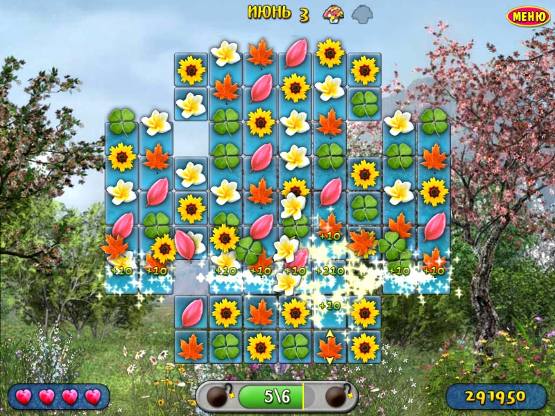 Посмотреть скриншот Цветочная ДолинаНа игровом поле этой логической аркады расположено множество цветков различных сортов и оттенков. Ваша задача — передвигать их таким образом, чтобы в результате каждого хода получалась группа произвольной формы, но состоящая не менее чем из 3 одинаковых цветков. Для успешного прохождения уровня вам необходимо за отведенное время наполнить несколько корзин цветами определенного сорта. Периодически цель уровня будет меняться, и вам предстоит наполнять цветами движущиеся по подъемнику корзины и очищать игровое поле от золотых плиток. Справиться с этими логическими задачками вам помогут бонусы — чтобы получить их, создавайте группы из 4 и более одинаковых цветов. Цветочная долина заинтересует не только взрослых, но и самым юных игроков, для которых предусмотрен особый игровой режим, в котором остановлено время на уровне и таймер на корзинках.