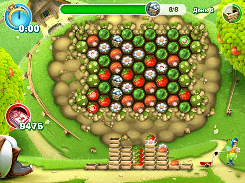 Игра «Зеленая долина» очень позитивная и понравится не только взрослым, но и самым маленьким игрокам. На игровом поле расположены различные фрукты, овощи и другие съедобные предметы. Удерживая кнопку мыши, вам нужно выделять цепочки одинаковых фишек так, чтобы их было не менее трех. Они падают в ящики, стоящие внизу, и трудолюбивый жук отвозит их в свои закрома. Кроме этого вы будете выращивать птенцов, собирать стройматериалы, и даже стричь овец. Выполняя все задания, вы постепенно отстроите ферму, которая в результате превратится в настоящий райский уголок.