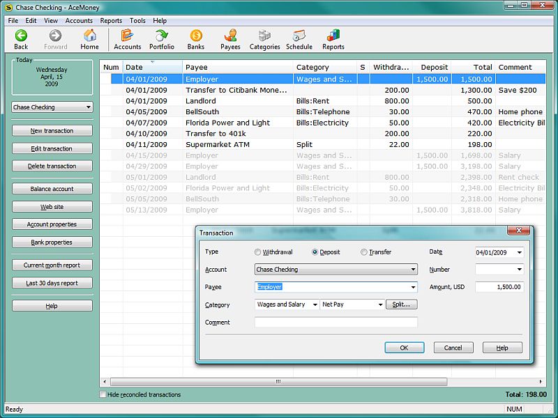 * Управление несколькими счетами различных типов: наличка, сберегательные счета, кредитные карты, долги, кредиты. Пользователь может сам задать новые типы счетов. Например, многие родители создают счета типа Карманные расходы для детей и приучают их контролировать свои расходы с помощью AceMoney.