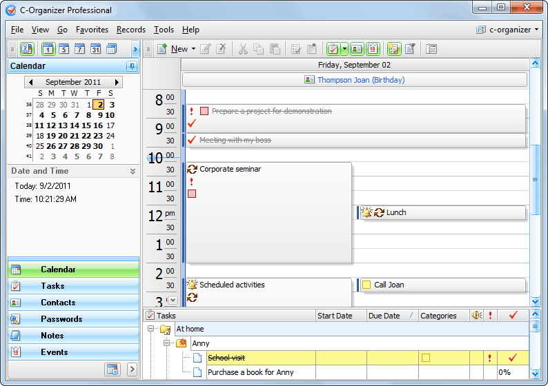 C-Organizer Professional - красивый и мощный персональный информационный менеджер. Эта программа поможет Вам организовать и спланировать Вашу работу и личную жизнь. Это планировщик, адресная книга, менеджер паролей и закладок, записная книжка и календарь событий, объединенные в одну мощную и удобную программу. C-Organizer поддерживает работу с базой данных в локальной сети. Тщательно продуманный интерфейс программы делает работу с приложением легкой и приятной. Встроенный планировщик позволяет создавать списки дел на день, что значительно облегчает распределение нагрузки и отслеживание выполнения ежедневных задач. Кроме того, существует возможность создания глобальных списков задач (ToDo lists) и объединения этих записей в группы. Гибкая настройка повторения задач делает планирование легким и удобным. Встроенная система оповещения всегда вовремя напомнит Вам о сроках выполнения задач, днях рождения и праздниках. Настройки программы позволяют показывать уведомления на экране компьютера или отправлять их по электронной почте. Есть возможность защиты базы данных C-Organizer паролем и шифрованием для ограничения доступа к Вашей персональной информации. Адресная книга программы имеет возможность хранения фотографий и настраиваемую структуру базы данных. Вы можете самостоятельно добавить в структуру записи необходимые Вам реквизиты. Для вашего удобства в программе реализована возможность сохранения структур как шаблонов для последующего использования при создании записей. Заметки в C-Organizer поддерживают RTF форматирование, вставку картинок, таблиц, гиперссылок на страницы в интернет, внешние файлы и любые записи в базе данных. Кроме того, C-Organizer имеет гибкую систему сортировки, возможность импорта и экспорта записей, автоматически интегрируется с почтовым клиентом и web браузером, установленным на Вашем компьютере. Сохраните всю Вашу важную информацию при помощи этой быстрой, удобной и легкой в использовании программы… Полное описание »