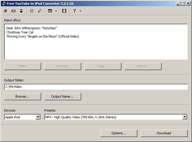 Free YouTube to iPod Converter имеет режим пакетной обработки, что позволяет скачивать несколько видео файлов или плейлистов одновременно.
