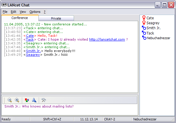 LANcet Chat - это бесплатный чат для малой локальной сети (до 10-20 пользователей). Не требует выделенного сервера, просто установите его на всех компьютерах и сразу начинайте общаться. Единственное ограничение - все собеседники должны быть в одном сегменте сети, без роутеров между ними. Позволяет отправлять приватные сообщения. Может автоматически стартовать при загрузке Windows и оставаться в системном трее, уведомляя вас о новых сообщениях всплывающими окнами и звуками. Можно игнорировать отдельных собеседников. Есть встроенная функция "Антибосс": при нажатии Esc чат сворачивается в трей или стирает все принятые и отправленные сообщения с экрана. Полное описание »
