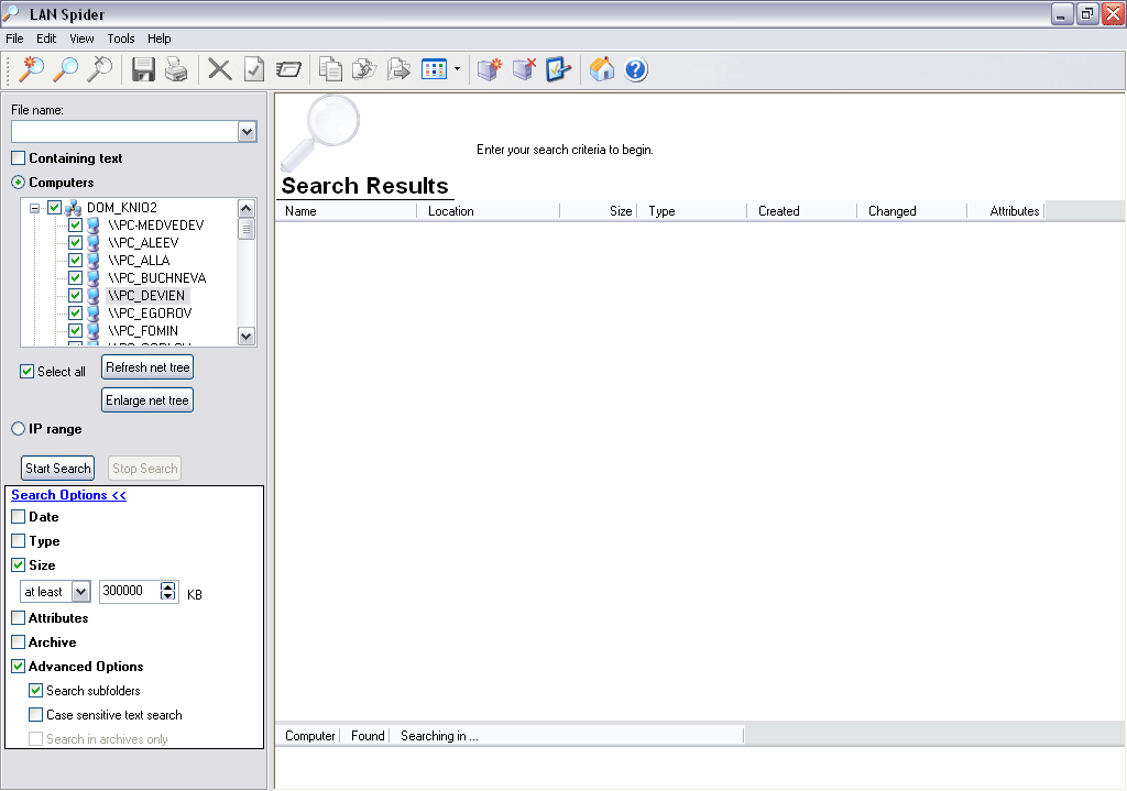 Программа для поиска файлов в вашей локальной сети. Ключевая особенность программы - поиск файлов в архивах ACE, ARC, ARJ, CAB, LZH, RAR, TAR, ZIP, ZOO. Кроме того, LAN Spider обладает потоковым поиском, это позволяет добиться уменьшения времени поиска файла в 3-5 раз. Сохранение результатов поиска в наиболее распространенных форматах (txt,csv,html,xls). Для сохранения в формате xls вам не нужно иметь установленную версию Microsoft Excel на компьютере. LAN Spider имеет расширенную систему составления поисковых правил, это позволит Вам наиболее четче составлять свои требования к искомым файлам. Полное описание »