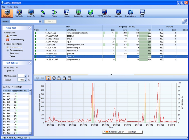 * мониторинг хостов и уведомления. NetWatch - наиболее расширенная часть программы - позволяет одновременно контролировать работоспособность нескольких хостов и времена их ответа. Можно также установить несколько порогов для того, чтобы NetTools уведомлял по электронной почте, сообщением или звуковым сигналом в случае возникновения любых проблем (то есть если хост не отвечает, или имеет место более медленная связь). NetTools предоставляет пользователям диаграммы с историей времени ответа и процентом потерянных пакетов, позволяя увидеть работоспособность и оценить загрузку сети во времени. Как во всех других инструментах, можно экспортировать эту информацию в текстовые файлы, а также и в Excel и HTML форматы;