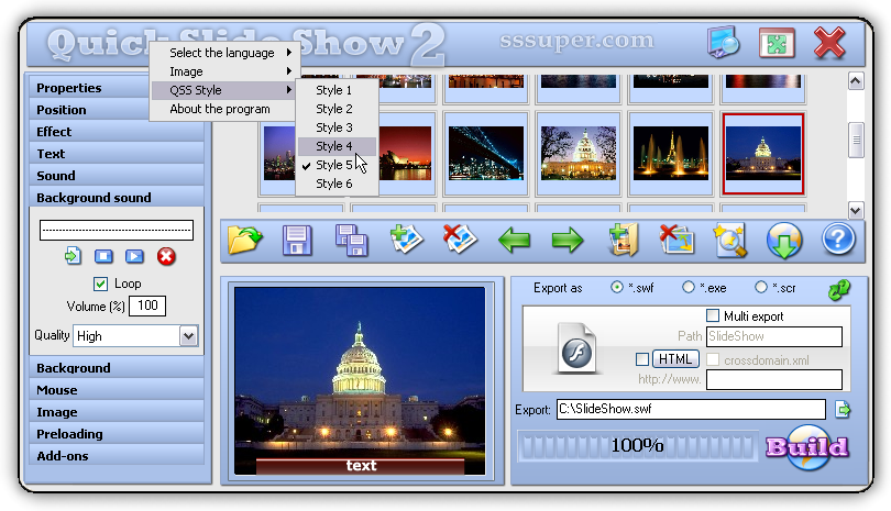 - web-разработчиков при создании flash-роликов Специалисты смогут существенно сократить время на разработку сайта, используя программу "Quick Slide Show". Благодаря ее гибким настройкам, можно быстро создать Flash-ролики, отвечающие различным параметрам. Это делает программу универсальным продуктом, как для профессионала, так и для новичка в области web-дизайна. Главные преимущества программы – быстрое и качественное создание слайд-шоу небольшого размера.