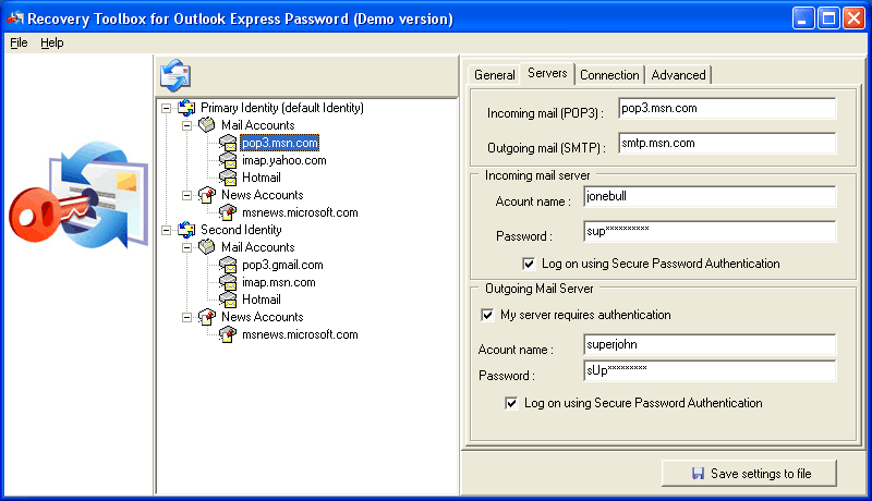Утилита Recovery ToolBox for Outlook Express Password восстанавливает пароли и визуализирует настройки почты и новостных служб версий Outlook Express версий 5, 5.5 и 6. Программа восстанавливает пароли и выводит информацию по всем, установленным удостоверениям текущего пользователя.