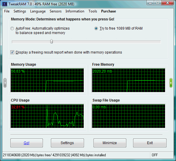 Посмотреть скриншот TweakRAMTweakRAM - утилита, служащая для очистки и оптимизации системной памяти компьютера, что позволяет увеличить быстродействие ПК в некоторых случаях. Программа умеет работать в автоматическом и ручном режимах, умеет освобождать физическую память, чистить кэши, работать со временными файлами подкачки.