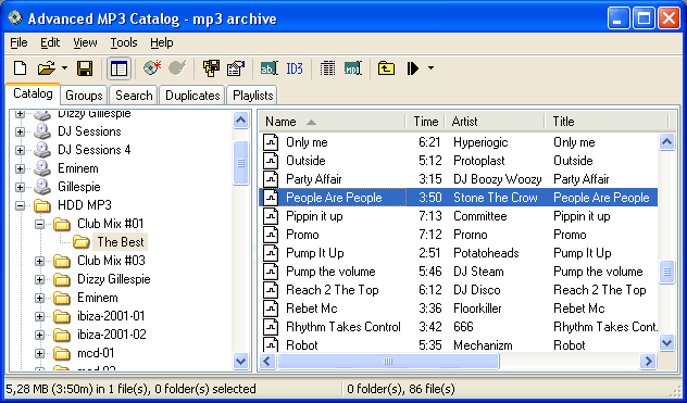 Advanced MP3 Catalog содержит ряд решений экономящих время работы. Функция пакетного редактирования тега позволяет изменить ID3 тег либо его часть у тысячи файлов за одну секунду. Пакетное переименование файлов автоматически организует файлы на диске в два щелчка мыши. Окно поиска дубликатов предоставляет возможность поиска одинаковых файлов в Вашей коллекции по различным параметрам.