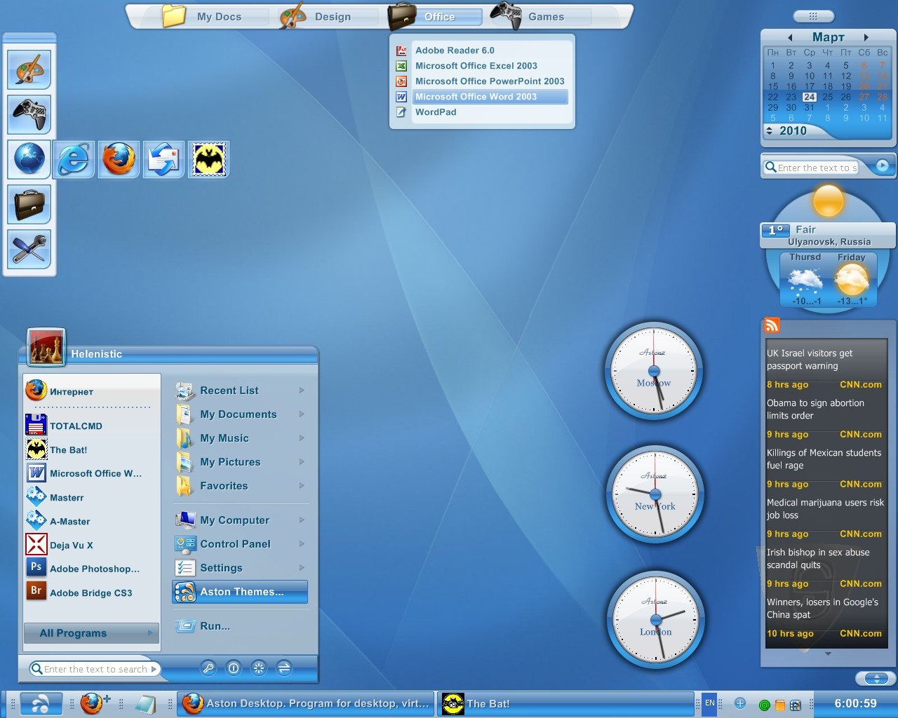 Gladiators Software выпускают долгожданную оболочку-заменитель рабочего стола Windows - Aston. Она делает Ваш рабочий стол еще более удобным, красивым, гибким. Многие пользователи Windows находят стандартный рабочий стол скучным и отстающим в плане оптимизации. Aston привносит свое инновационное видение того, каким должен быть рабочий стол. Уникальным продукт Aston делает возможность настройки любого из элементов оболочки по Вашему вкусу. Вы можете свободно выбирать из множества тем и остановиться на той, которая Вам больше всего понравится. Если же Вы хотите проверить свои собственные дизайнерские способности, Вы можете воспользоваться Мастером создания тем для воплощения в жизнь своих фантазий и творческих решений. Все очень наглядно. Каждый элемент темы: меню, рабочий стол, панели, - может быть изменен. Таким образом, Вы сами создаете наиболее удобную для Вас рабочую среду. Виджеты еще более расширяют понятия практичности, удобства и простоты использования. Вы хотите знать прогноз погоды, объем доступных ресурсов системы, время или что-то еще - нет проблем! Виджеты с изяществом дополняют красоту и функциональность стартового меню и панелей. Вы имеете полный контроль над тем, что и как должно отображаться в каждом элементе Aston. Это одна из самых устойчивых и надежных оболочек, невероятная простота настройки и использования которой не останется незамеченной даже начинающим пользователем! Перейти на Aston легко, так как в него входят лишь знакомые Вам элементы, к тому же Aston делает их еще более эффективными. Встроенный поиск позволит Вам быстрее и с большим удобством находить файлы как на локальных дисках компьютера, так и в Интернете. Эффективность и удобство - это лишь одна сторона этой мощной программы. Aston - превосходный продукт во всех планах, начиная с поддерживаемых операционных систем (Windows XP/Vista 32 и 64-битные), поддержки многих языков и т.д. Aston - воплощение красоты, стиля, удобства и эффективности, это рабочий стол нового поколения. Полное описание »