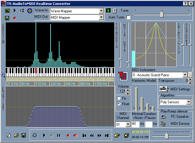 TS-AudioToMIDI предназначена для распознавания цифровых музыкальных записей. В отличии от большинства подобных программ, TS-AudioToMIDI может распознавать как монофонические (одноголосые) так и полифонические (с несколькими голосами и инструментами) мелодии. Обычно, подобная задача занимает несколько часов работы у профессионального музыканта, однако при помощи нашей программы она может быть решена много быстрее и не требует наличия музыкального образования. TS-AudioToMIDI может распознавать как музыкальные записи, так и музыку непосредственно в реальном времени. TS-AudioToMIDI умеет работать со многими форматами - такими как mp3, wav, треки CD-Audio. Результат распознавания представляется в MIDI формате. Это дает возможность: использовать любимую мелодию для оформления Вашего сайта; загрузить любую мелодию в мобильный телефон для использования в качестве звонка; открыть полученный MIDI файл нотным редактором для аранжировки и модификации; использовать MIDI файлы в для режима предварительного просмотра файлов аудио архива, что позволяет сильно уменьшить трафик. Режим распознавания в реальном времени позволяет распознавать музыку напрямую с микрофона или линейного входа звуковой карты. Это позволяет на лету подменять звучание инструмента, например гитару заменять на скрипку или фортепиано, или любой другой инструмент присутствующий в Вашем MIDI синтезаторе. Полное описание »