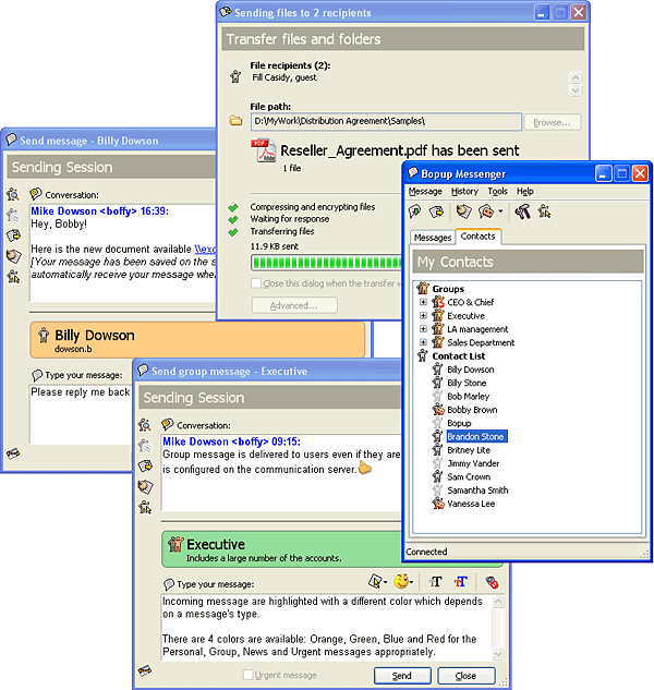 Вы можете легко объединить сотрудников из всех офисов и отделений организации в единую систему обмена сообщениями с возможностями отправки файлов, приоритетных сообщений с поддержкой гиперссылок, графических эмоций (пиктограммы, "смайлики") и форматирования текста сообщений, а также передавать важные документы с сервера конкректным пользователям. Программа позволяет настроить личный Список Контактов, который доступен пользователю из любого рабочего места и офиса, и позволяет видеть кто из контактов в данный момент на связи.