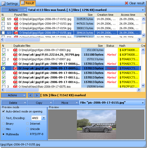 Программа Duplicate File Detector - это мощный инструмент для поиска дубликатов файлов на вашем компьютере. Вы сможете найти дубликаты файлов любых типов, будь то графические, музык. Для определения дубликатов можно используются критерии: имя файла, размер файла, либо его содержимое. Для мультимедиа файлов (MP3, OGG/Vorbis, WMA) в качестве критериев также можно использовать теги "Артист","Альбом","Название песни","Комментарии к песне". Если вы имеете на компьютере сотни и тысячи документов, картинок, фотографий, музыки, видео, то часто испытываете сомнение что "... этот файл вроде у меня уже есть, но где ...". На помощь к вам приходит Duplicate File Detector. Эта программа - мощное и в тоже время простое в использовании средство для поиска дубликатов файлов. Не нужно тратить свое время на просмотр своих каталогов на наличие дубликатов, доверьте это умной программе. Вам останеться только решить что делать с найденными дубликатами (копировать, удалить и т.д.). Позвольте программе Duplicate File Detector проанализировать содержимое вашего жесткого диска, и вы будете удивлены огромному количеству одинаковых файлов! Вы сможете освободить место на диске, удалив ненужные дубликаты. Подробнее: http://www.al-soft.com/dfd/duplicate-file-finder-ru.shtml Полное описание »