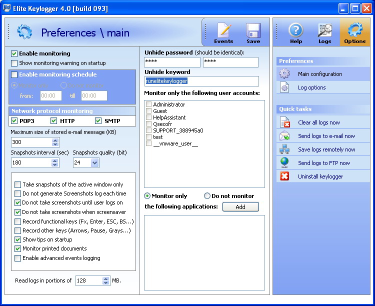 The best hiding mechanism that prevents keylogger from being revealed, printed documents monitoring, screenshots are not taken when the PC is idle, now you can save all the captured screenshots into JPG images by only one click, new logs' e-mailing techno