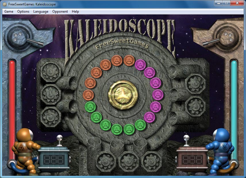 Посмотреть скриншот KaleidoscopeРазноцветные фишки выложены в симметричный узор на игровом поле. Перед началом игры фишки хаотически перемешиваются. Ваша задача восстановить исходный узор. Трудность в том, что передвигать фишки можно только целым рядом по горизонтали или диагонали.