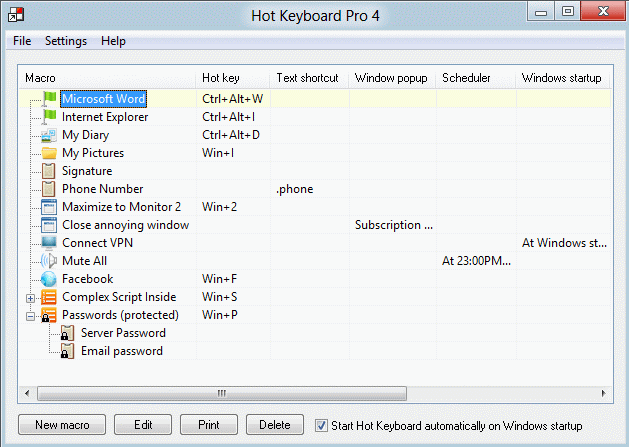 Менеджер 'горячих клавиш'. Не хороните себя под грудой ярлыков на рабочем столе! Не тратьте время на поиски нужного приложения в недрах компьютера! Не пользуйтесь мышкой тогда, когда все можно сделать намного проще! С Hot Keyboard Вы можете моментально осуществить любые действия или их группы. Просто назначьте на них комбинацию «горячих клавиш», и вы сможете запускать любые программы, открывать документы, выполнять различные операции с окнами, подключаться к Интернетуи перезагружать компьютер. Вам будет легко открывать Ваши любимые Web-страницы сразу, без необходимости вводить адрес или искать в 'Избранном', осуществлять быстрый запуск заставки, выполнять последовательности различных действий, запускать действия в указанное время и многое другое! И все это можно сделать всего лишь нажатием нескольких клавиш. Легко, быстро, удобно! Hot Keyboard может объединять действия в группу и показывать ее в виде меню по нажатию горячей клавиши (чтобы не назначать каждому действию отдельную комбинацию). Вы сможете выполнять последовательности различных действий (запустить программу, нажать несколько клавиш, закрыть программу) так же легко. Кроме того Hot Keyboard может распечатать список горячих клавиш, и Вам не придется вспоминать комбинации. Эта программа сэкономит Ваше время, облегчит работу, уменьшит напряжение кистей рук и поможет сохранить концентрацию мысли на выполняемой задаче. Кроме того, Вы будете выглядеть более профессионально, если меньше пользуйтесь мышью. С Hot Keyboard любое действие будет таким же быстрым, удобным и простым, как … нажатие на клавишу! Полное описание »
