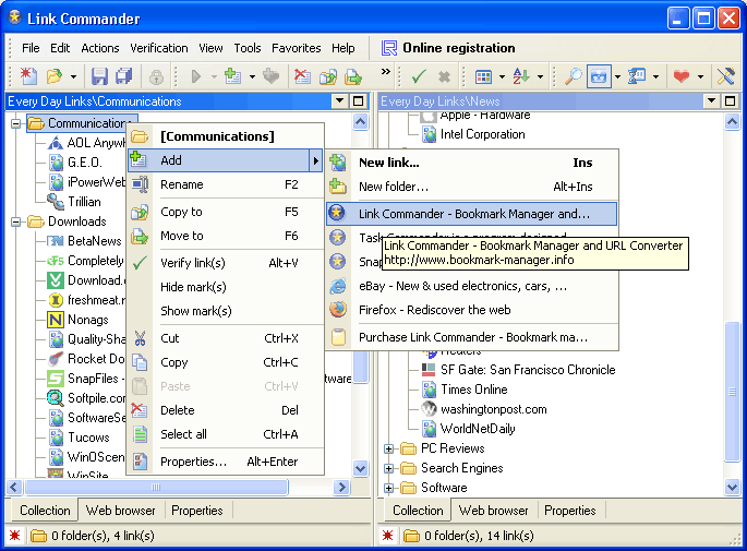 Импорт и экспорт избранных закладок реализованы как для основных Web-браузеров, так и для обычных html-документов. Отдельные папки и/или целые коллекции могут быть защищены паролем. Вы можете обмениваться коллекциями ссылок с друзьями и коллегами при помощи функции пересылки коллекции по электронной почте.