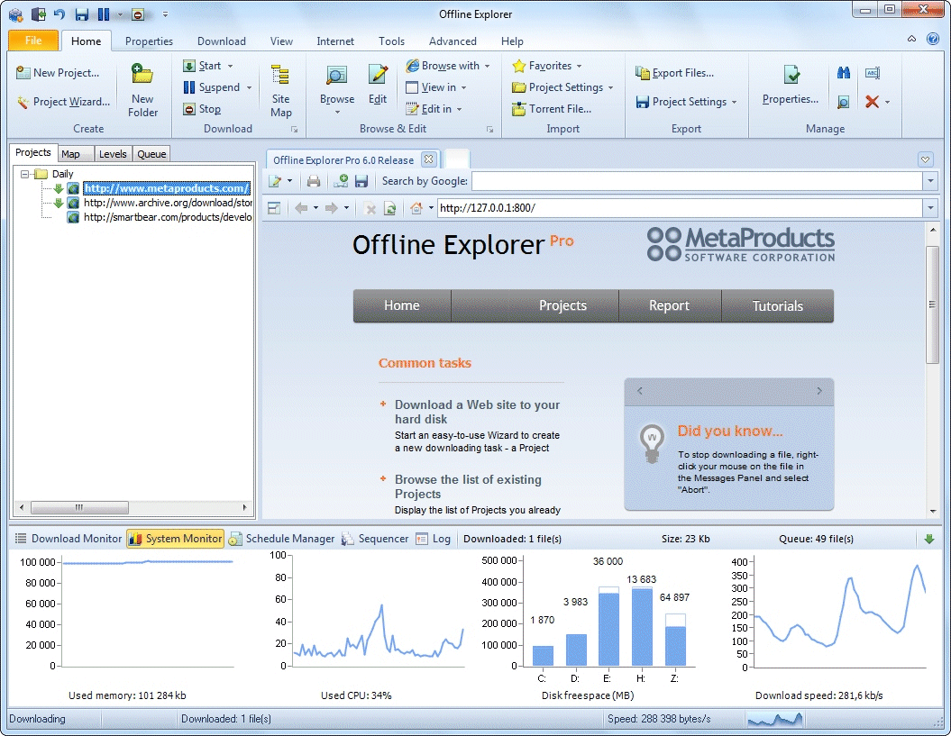 Offline Explorer Pro предназначен для быстрой и качественной загрузки Web-сайтов, защищенных серверов (HTTPS), файлов на FTP серверах, а также потокового мультимедиа MMS и RTSP (MS Media Player и RealPlayer). Загрузку сайтов можно регулировать используя многочисленные настройки проектов, разрешать или запрещать адреса с помощью ключевых слов, ограничивать длительность загрузки по времени, по размеру информации или количеству файлов. Полностью поддерживается загрузка защищенных паролем сайтов. Мы добавили новые возможности для вычисления сложных выражений в Java-скриптах, что позволяет более точно загружать современные сайты. До этого было невозможно автоматически загружать ссылки, составленные из нескольких частей внутри скриптов. Уникальная возможность замены адресов по указываемым правилам позволяет избавляться от загрузки зеркал сайтов, закачивать страницы, предназначенные только для печати, ускорять загрузку сайтов с картинками. Полное описание »