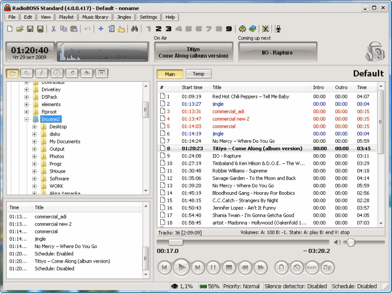 - поддержка форматов mp3, wma, wav, ogg, CD audio - автоматическая генерация плейлистов по шаблону - индексированная база данных композиций и быстрый поиск по ней - одновременная работа с двумя плейлистами - встроенные эффекты - 12ти полосный эквалайзер - функция голосовой трек (voice track) - поддержка режима плавных переходов (кроссфейдов) - автоматический контроль громкости - обрезание тишины в начале и конце файла - независимый второй выход (на вторую карту; стерео сплит; разделение передние/задние колонки) - расписание - цветовая индикация в плейлисте - перекодировщик файлов - граббер CD - поддержка профилей (индивидуальные настройки) Полное описание »