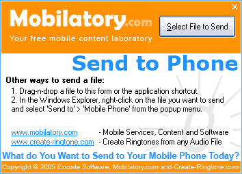 Посмотреть скриншот Send To PhoneЗакачайте контент (рингтоны, обои, Java игры, видео и другие файлы) на сотовый через WAP. Кабель или адаптер не нужен!