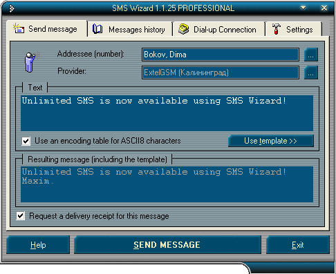 Посмотреть скриншот SMS Wizard LITEПрограмма SMS Wizard предназначена для отправки коротких сообщений (SMS) либо через Internet используя стандартный протокол SNPP или непосредственно с GSM-совместимого телефона подключенного по COM-шнурку, IrDA, BlueTooth или через NOKIA PC Suite.