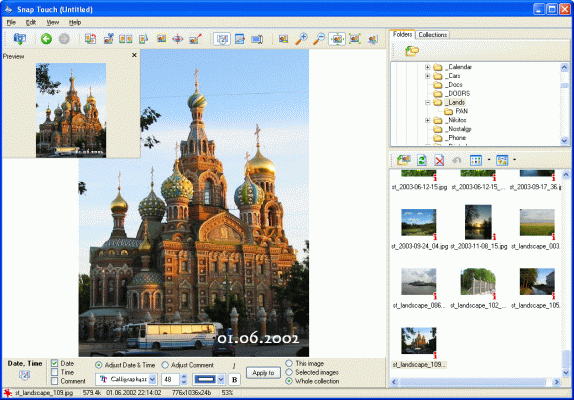 SnapTouch работает со служебной информацией снимка (EXIF) и может отображать ее. Кроме того, программа использует эти данные при переименовании файлов, для записи комментариев и для проштамповки снимков. Перед печатью фотографий пользователь может нанести уникальную дату и время съемки каждого кадра. Опция полностю автоматизирована и имеет богатые настройки.