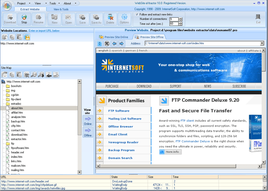 Программа Web Site Extractor создана для высокоскоростной загрузки веб-сайтов Интернета в соответствии с заданными вами условиями и ограничениями. Например, вы можете установить фильтры на названия директорий, имена доменов и файлов, типы загружаемых файлов и их размеры, другие свойства. Программа может скачивать одновременно до 100 файлов, что существенно ускоряет загрузку информации по сравнению с обычными браузерами. Результат поиска сохраняется в указанную вами директорию и содержит только те файлы и директории, которые соответствуют параметрам наложенного фильтра.