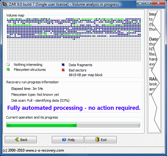 ZAR - мощное средство восстановления данных с поддержкой длинных и русских имен файлов. Поддерживается встроенное сжатие NTFS. ZAR работает под Windows 2000, XP или 2003 и восстанавливает разделы FAT и NTFS, включая и расположенные на аппаратных массивах RAID0 или RAID5. Есть режим восстановления цифровых фотографий и автоматический поиск потерянных разделов. ZAR работает в режиме "только чтение", и не делает никаких изменений на поврежденном томе. Это позволяет избежать риска дальейшего повреждения тома при восстановлении. Такой подход требует дополнительного носителя, на который сохраняются восстановленные данные (обычно это второй жесткий диск). Полное описание »