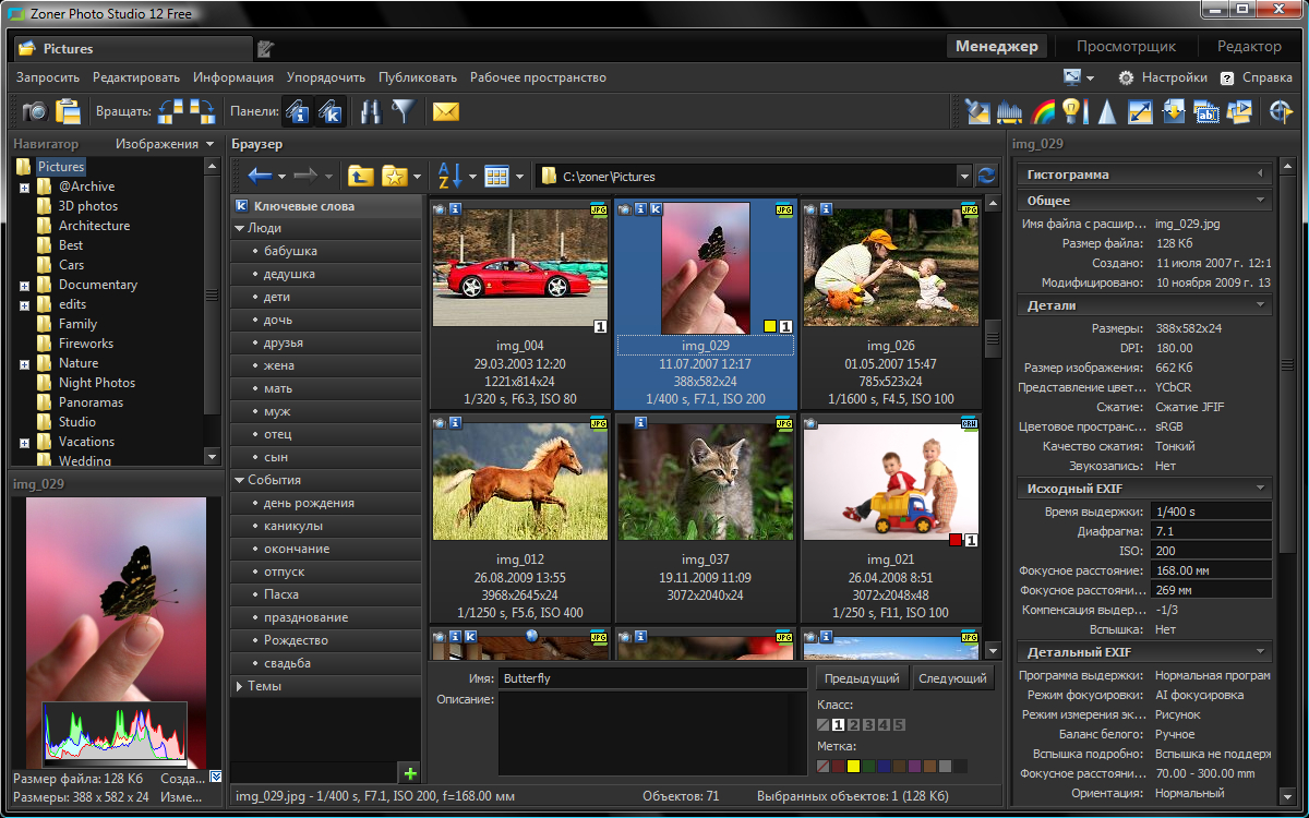 С новым Zoner Photo Studio Free можете работать или буквально играть со своими фотографиями. Почему терять время изучением нескольких разных программ, если есть единственная программа, с помощью которой можно копировать, организовать и публиковать фотографии? Zoner Photo Studio Free облегчает копирование снимков из фотоаппарата, их обработку и организацию, включая поиск для вас в этот момент нужных фотографий, и также управление обычными проблемами, креативные эффекты и публикацию фотографий на бумаге или в интернете. Zoner Photo Studio Free сделает Вашу работу с цифровой фотографией более легкой, независимо от того, одна у Вас или сотни фотографий. Обработка и использование эффектов можно очень просто прибрать к рукам, притом это все дает чудесные результаты. Вы можете организовать свой простой и эффективный фотоархив с помощью EXIF информаций об изображениях. Но ваши данные не будут „в западне“ внутри программы! Вы их можете видеть и свободно ими пользоваться в любой другой программе. В Zoner Photo Studio Free вы быстро сориентируетесь и оцените также его гибкость. Эта программа создавалась отчаянными фотографами для начинающих, которые не хотят тратить весь день на изучение программы. Мы знаем, что вы охотнее займете свое свободное время созданием фотографий и обсуждением их с друзьями, чем их долгой обработкой. Zoner Photo Studio Free вам поможет подготовить ваши фотографии легко и быстро! Темная обстановка программы бережет ваши глаза и позволяет так лучше сосредоточиться на проблемах фотографий. При возникновении проблемы, ее решение будет легким, неважно, говорим ли мы об устранении красных глаз или, фокусировании или о чем то другом. Достаточно только выбрать быструю фиксацию и компьютер сделает все за вас. Очень просто и быстро также расположение изображений с помощью Каталога. Полное описание »